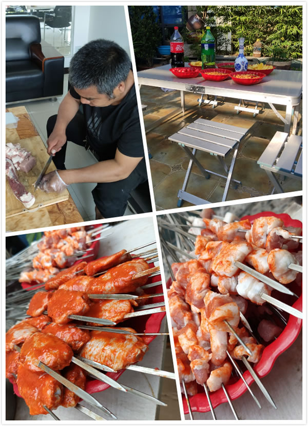 等回到公司,大家分工明确,支桌子,驾烤炉,准备食物,切肉,穿串,大家配合默契,忙的不亦乐乎。